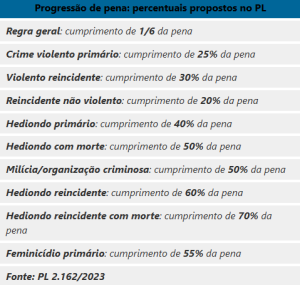 Para crimes violentos contra a pessoa ou o patrimônio, o texto cria percentuais próprios de cumprimento da pena para a progressão de regime.